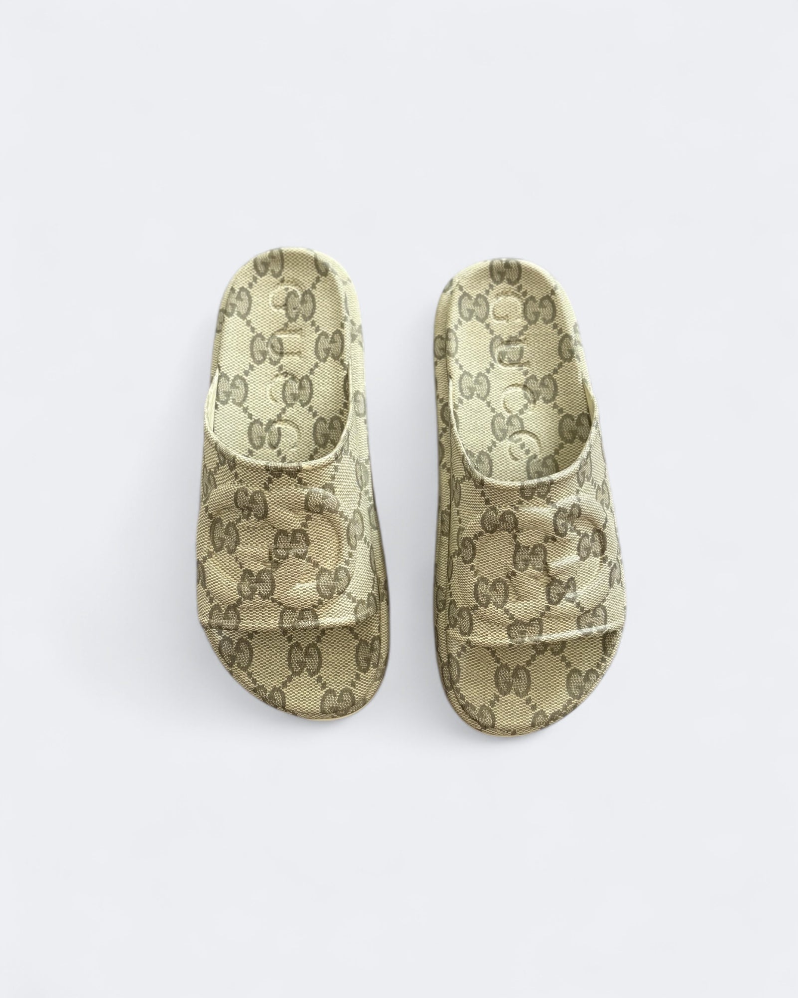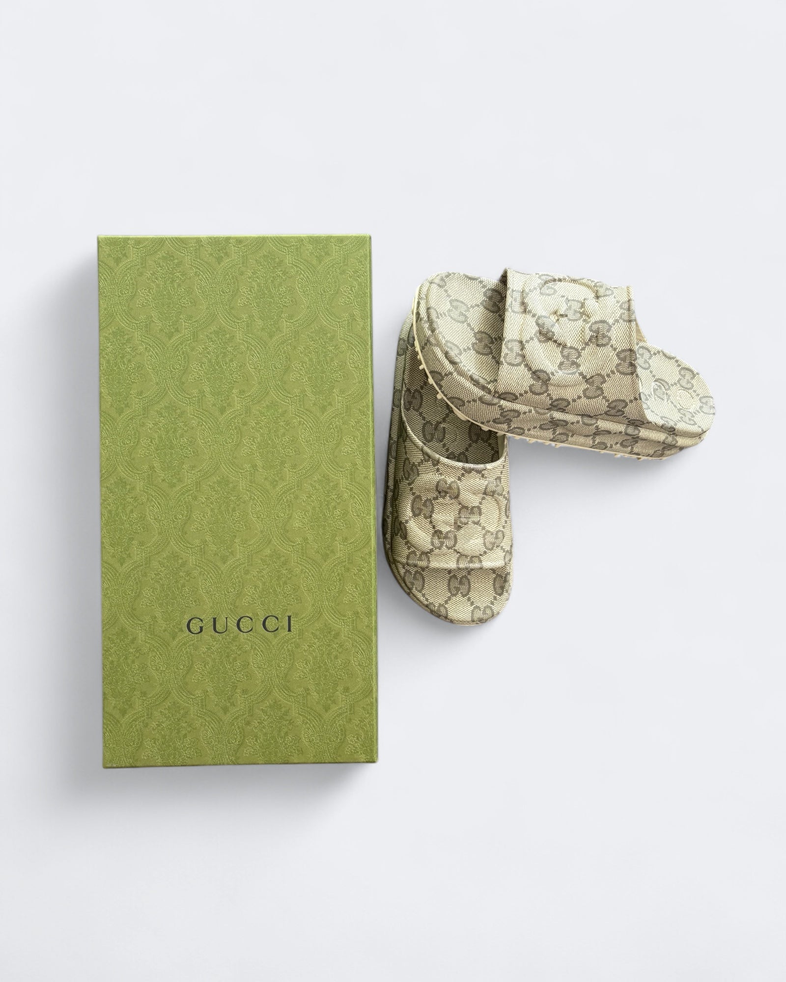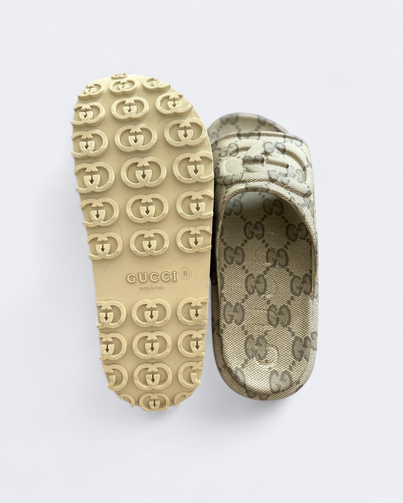 Ces claquettes de la marque Gucci sont à plateformes avec un imprimé Suprême GG, neuves avec la boîte et les housses de protection.