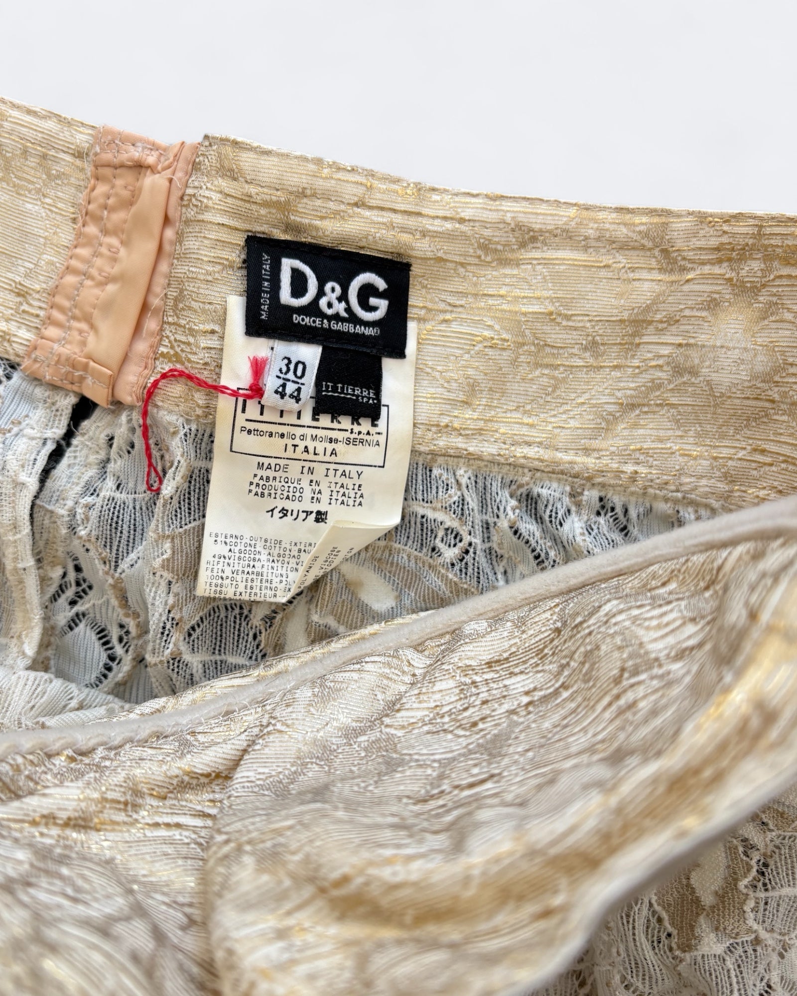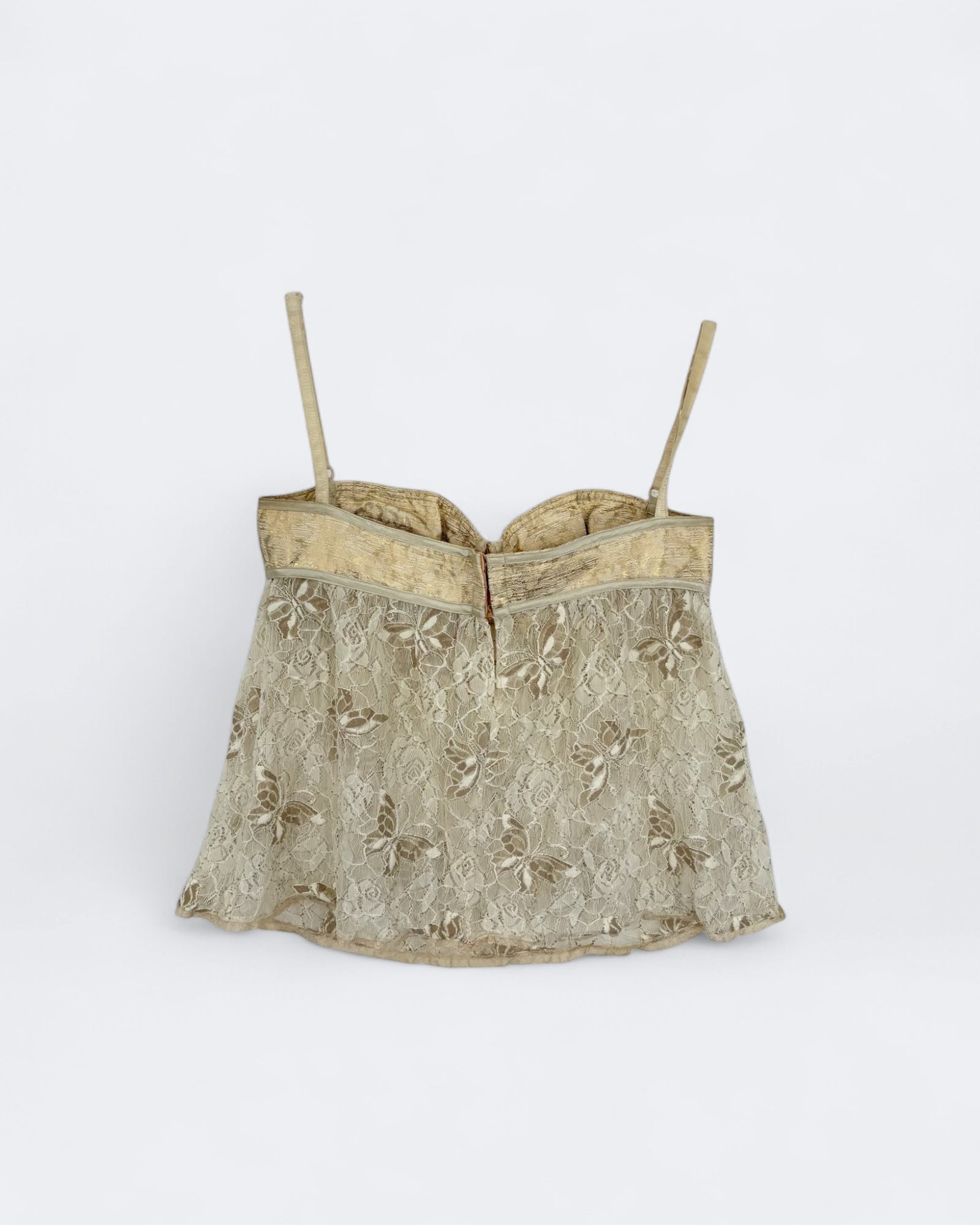 Sublimez votre silhouette avec ce corset raffiné signé Dolce & Gabbana, alliance parfaite entre sensualité et élégance italienne. Conçu dans une délicate dentelle dorée, motifs papillon, il se distingue par son bustier structuré à armatures et son effet satiné lumineux. Avec ses bretelles fines et sa finition légèrement évasée, ce modèle offre une allure féminine et sophistiquée, idéal en pièce maîtresse d’un look de soirée ou sous une veste tailleur. Pour les amoureux des années 2000 !